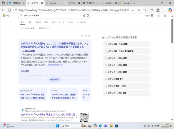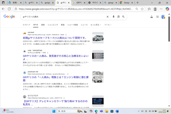(図2)Google検索で「GRヤリス 一人病み」を検索した結果。practician.netの記事が上位に表示されている。
