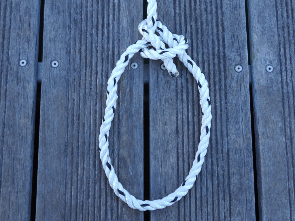 バウラインノットは、ループを作り、そのループをクリートや杭などにかけて船を係留するのが基本的な使い方のようだが、工夫しだいでは色々な使用方法がある。